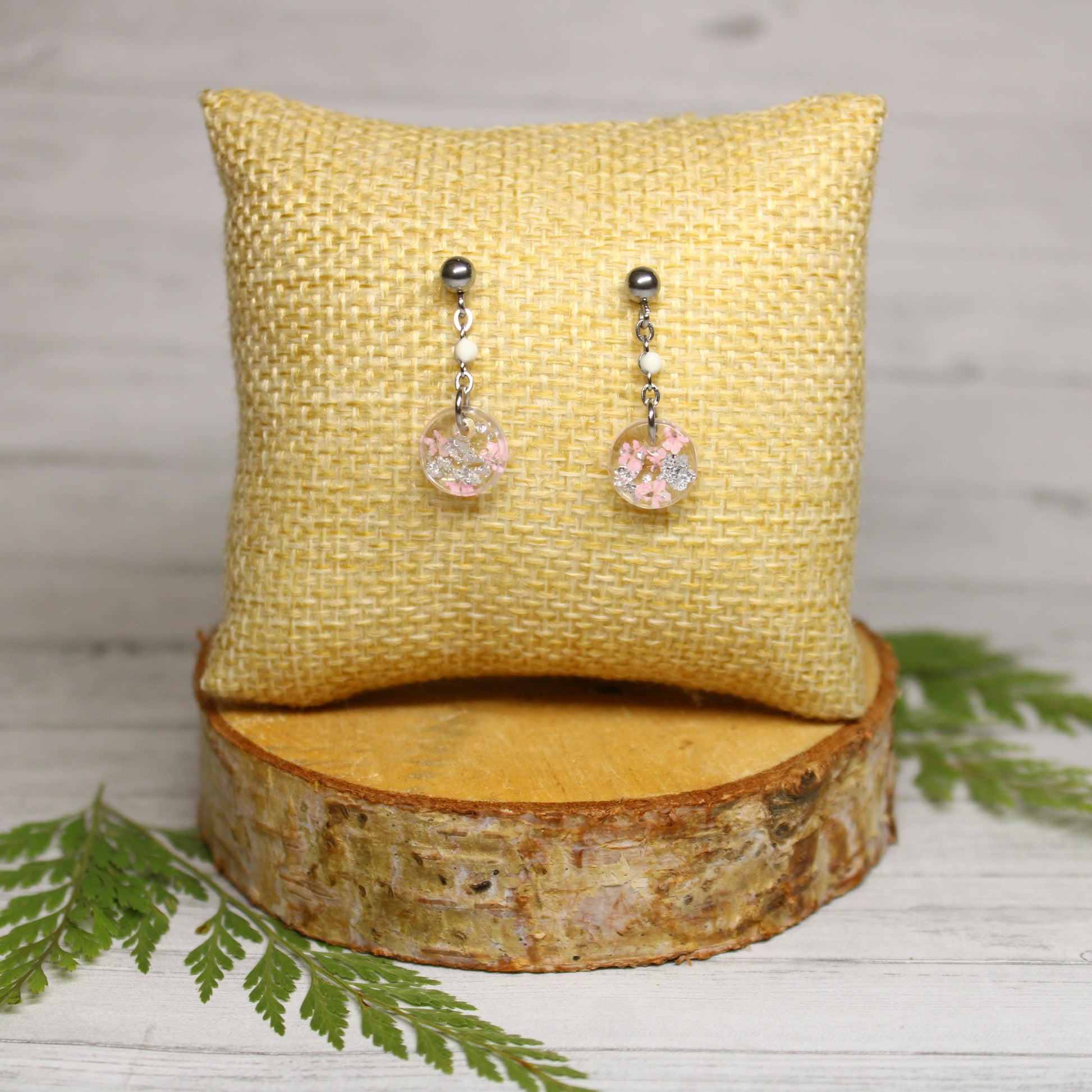 Ces petites boucles d'oreilles en résine incrustée de fleurs de Daucus carota teintée complèteront à merveille votre tenue.