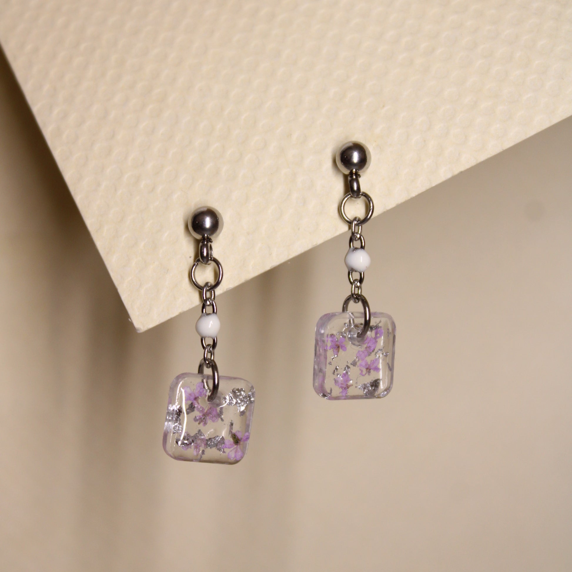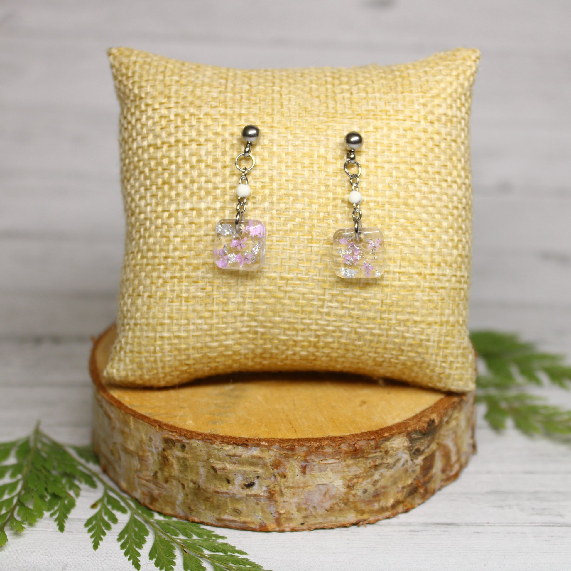 Ces petites boucles d'oreilles en résine incrustée de fleurs de Daucus carota teintée complèteront à merveille votre tenue.