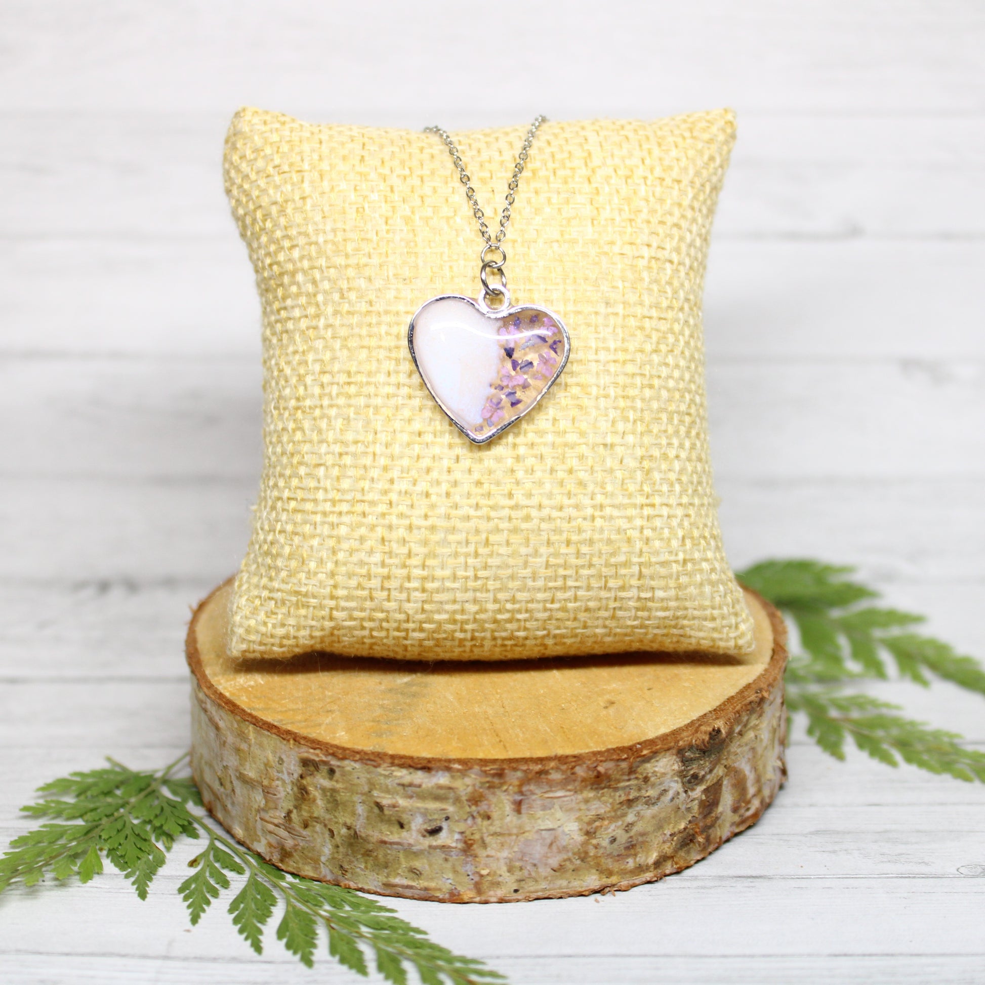 Préservée dans une résine cristalline, la violette dévoile ses nuances subtiles, rehaussées par l’éclat argenté de l’acier inoxydable. Le collier devient alors un bijou élégant et poétique, à la fois raffiné et intemporel.