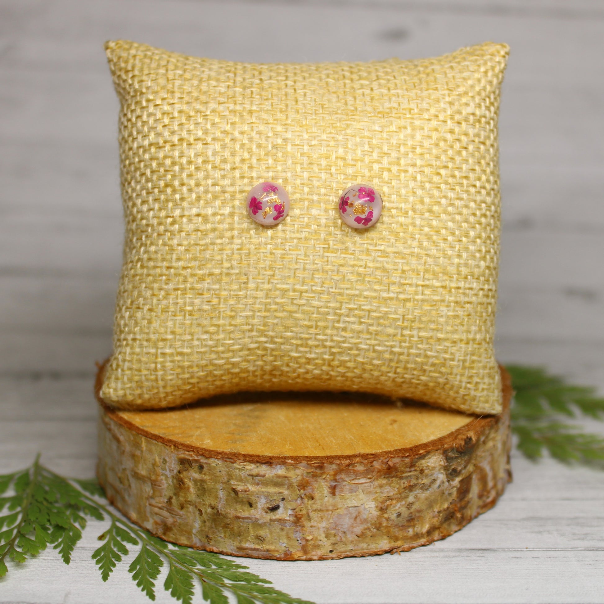 Ces petites boucles d'oreilles en résine incrustée de fleurs de Daucus carota teintée complèteront à merveille votre tenue.